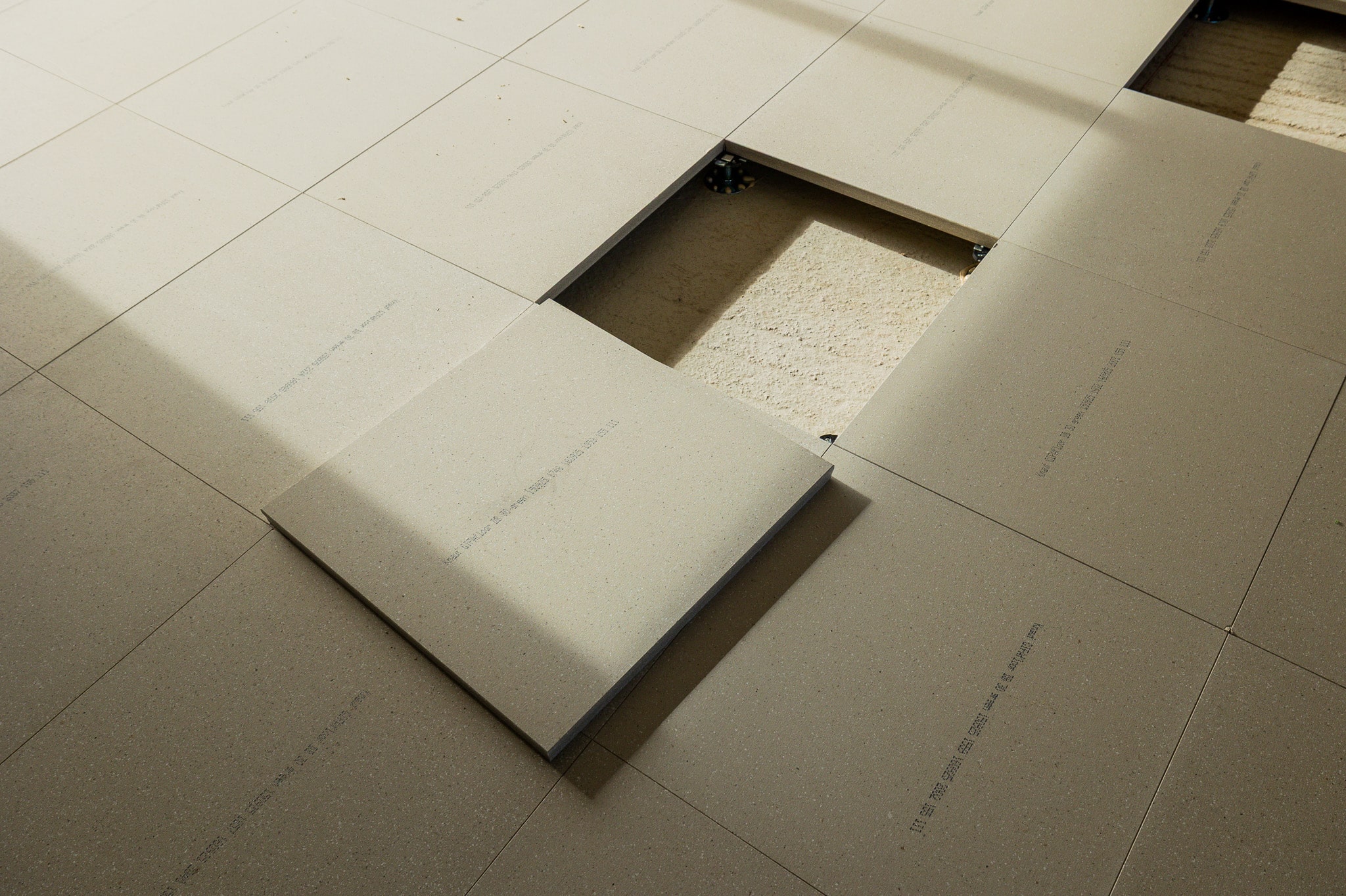 Vrij opgelegde vloerelementen op verstelbare stalen pedestals. Volledig toegankelijke installatieruimte voor data-, elektrotechnische en klimaattechnische voorzieningen.