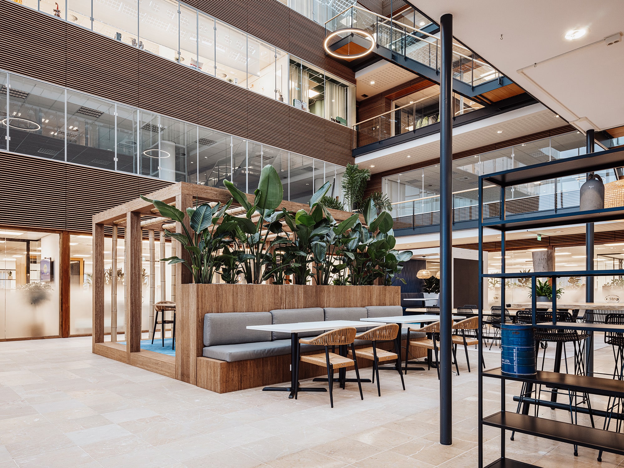 Het atrium bestaat uit een combinatie van open en meer besloten plekken, geschikt voor zowel kleinere als grotere groepen. Door de samenhangende keuze van materialen en kleuren vormt de ruimte een functioneel en harmonieus geheel.