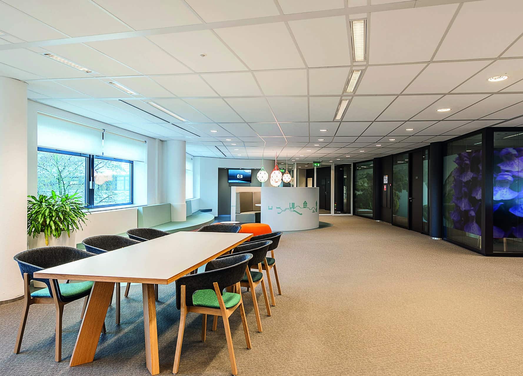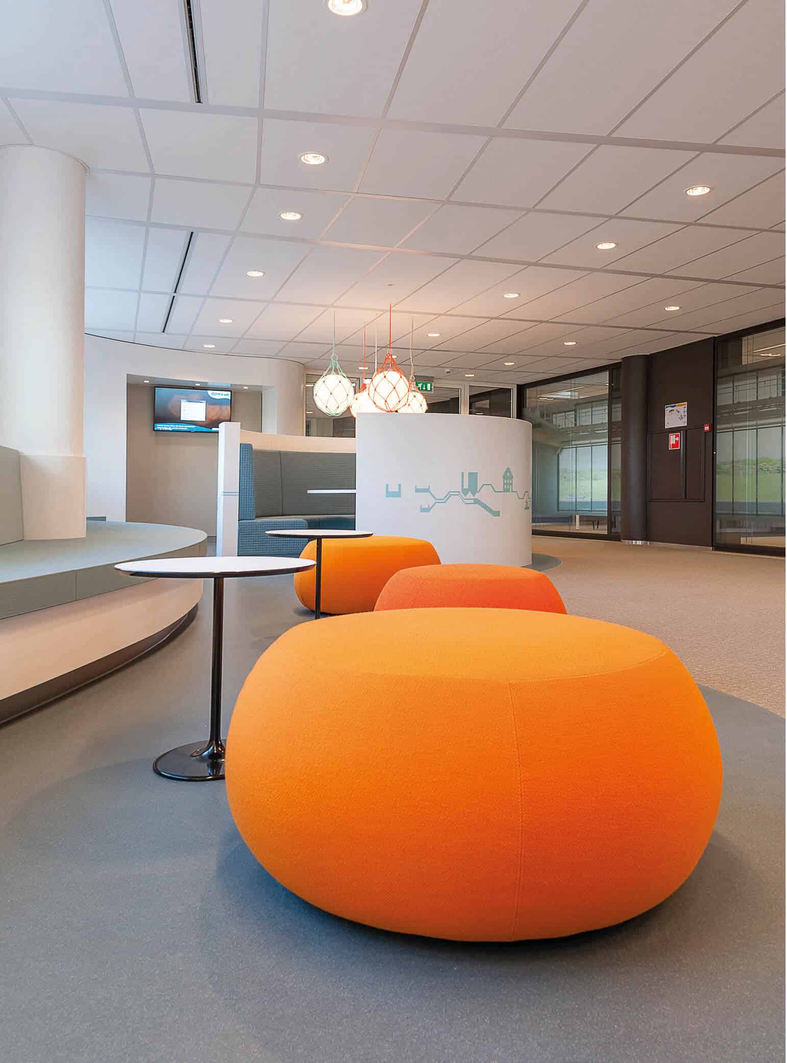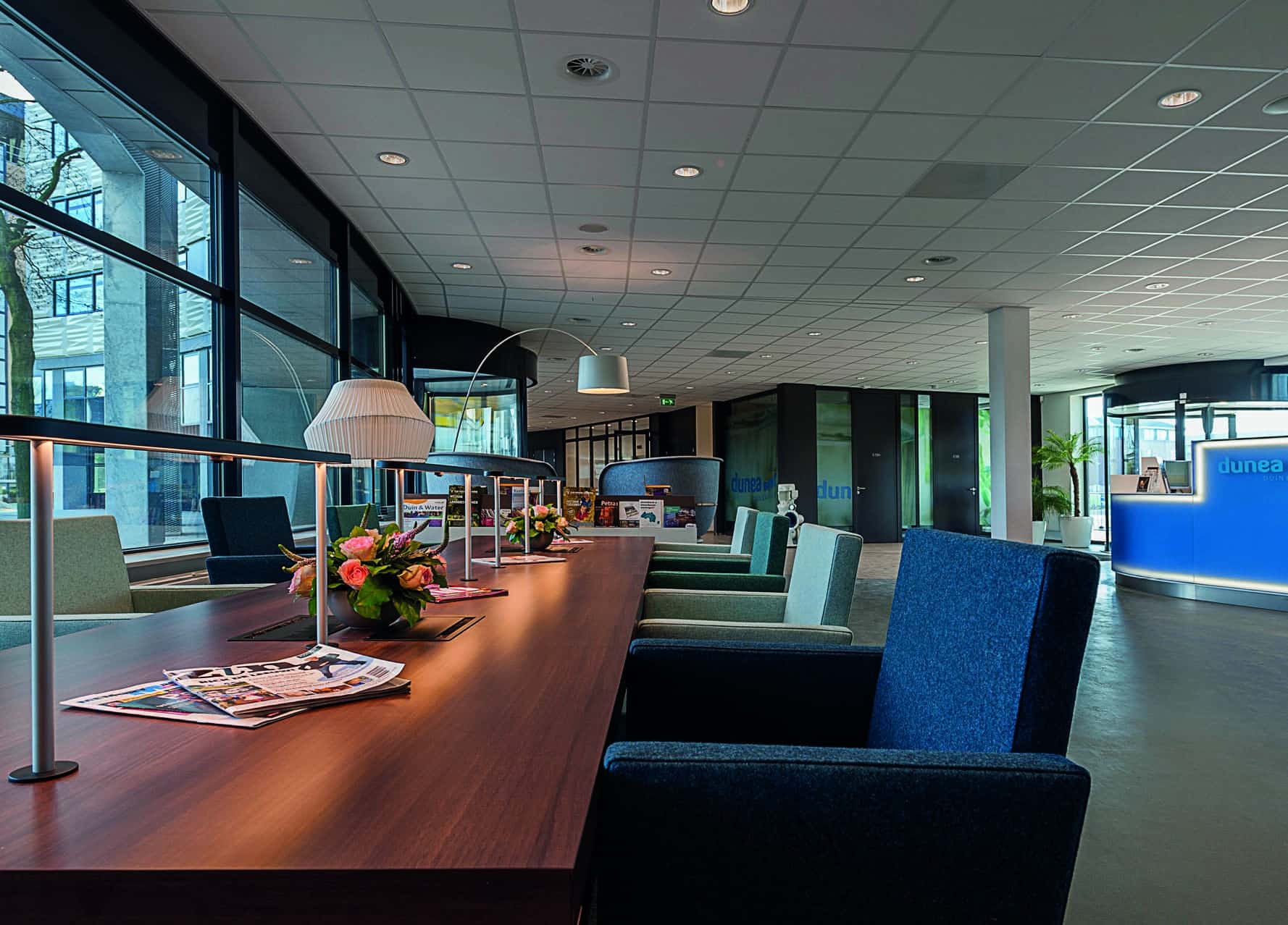 Samen met de opdrachtgever kozen we voor bijzondere lijnen en vormen, passend bij de uitstraling van Dunea. De combinatie van hoogwaardig linoleum en kwalitatieve tapijten zorgde voor de juiste balans in sfeer en geluid. Ook in het ontwerp stond comfort centraal: geluidsdemping, luchtkwaliteit, lichtinval en privacy kwamen samen in een werkomgeving waar prettig gewerkt wordt. We realiseerden systeemwanden, pantries, waterbars en receptiebalies in het gerenoveerde kantoorpand uit de jaren negentig.